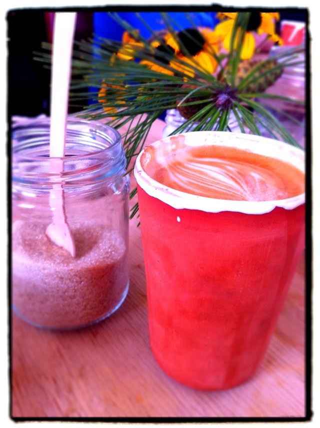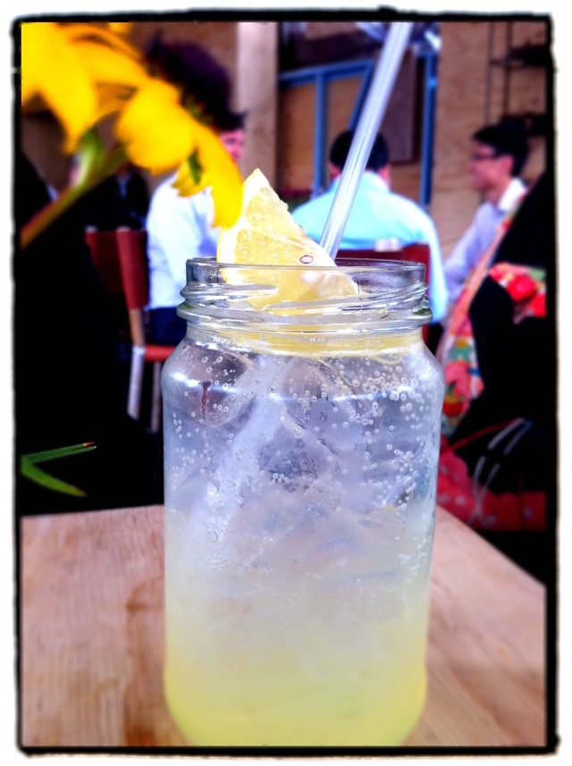We started off with some sublimely refreshing drinks, a house-made lemonade and a ginger ale, served in the ubiquitous jam jars, and decided between us to have the spicy chicken, with quinoa and yoghurt, and the pumpkin, chickpea tagine with green chilli yoghurt.