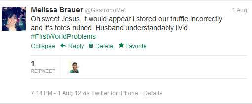 Sara also assured me that I was not the first person to have neglected their fungus, which made me feel slightly better. With my replacement truffle safely packed away in the fridge at work, it was time to let the Twitterverse know that things had worked out, and thank people for their help. (And a special shout out too here to ‘Truffle Daryl’ at Aureus Park Truffles who also offered assistance)