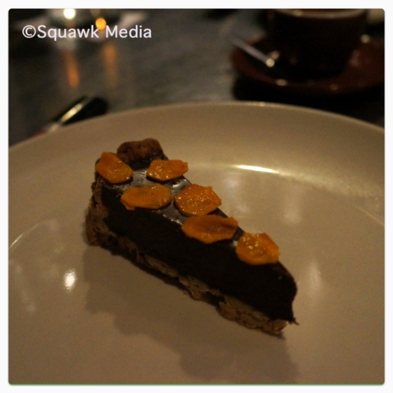 The meal lost none of its momentum in the ‘wow’ stakes when it came to the dessert. We were spoiled with 3 different dishes – the beautiful satiny buttermilk pannacotta was first, made with local nalo meli honey and served with fresh tropical fruit, and some figs from the tree right outside the restaurant. We then tried the ‘financier’ (from the friand family of French baked goods) made with browned butter and almond meal, and served with prunes which had been stewed in Earl Grey tea, and some whipped creme fraiche. I’m still dreaming about this fluffy treasure 3 weeks later. The piece de resistance for me however, being a self-confessed chocoholic, was the stunning salted dark chocolate pretzel tart which had wafer-thin slices of candied tumeric on top. The tart base was made up of crushed pretzels, offering its saltiness as the perfect foil to the rich, smooth dark chocolate filling. The tumeric was hot and sweet all at once and it just rocked. This was a flavour explosion of the highest order and one of the best things I have ever put in my cake hole.