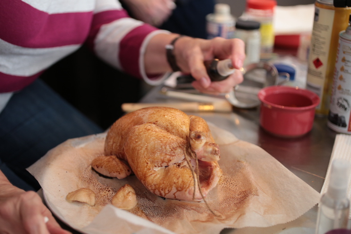 Think that chicken is roasted? Think again. Try a raw chicken sprayed with browning essence, a shake of paprika and liberal application of a blow torch to tighten the skin.