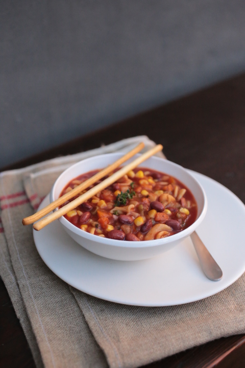This is a bowl of canned minestrone soup, demonstrating the importance of props – with the right combination of napery, breadstick and crockery,and some beautiful natural light, it doesn’t look terrible.